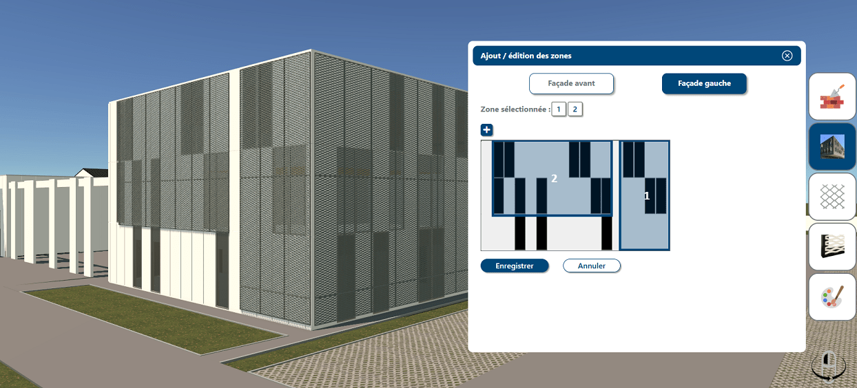 Dankzij onze 3D-simulator kunt u in realtime zien hoe onze producten eruitzien wanneer ze worden gebruikt als metalen gevelbekleding. Ontdek al onze strekmetalen mazen of creADesign-motieven en creëer uw eigen bekleding op maat. Bekijk uw project vanuit alle hoeken en test het effect van de lichtinval, zowel van binnen als van buiten en op verschillende momenten van de dag. Met slechts een paar muisklikken krijgt u via onze intuïtieve interface een realistisch beeld voordat u aan de slag gaat. Deel uw simulatie na voltooiing vrijelijk met uw klanten en prospects en valideer uw project!