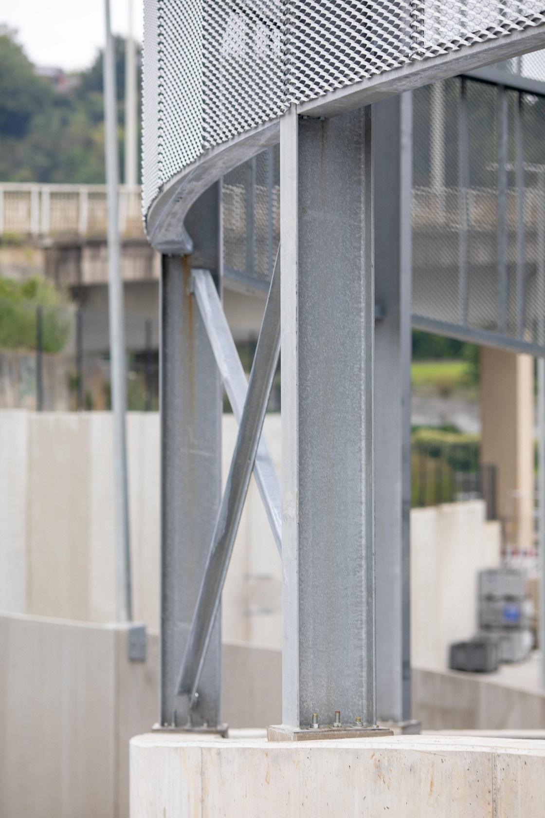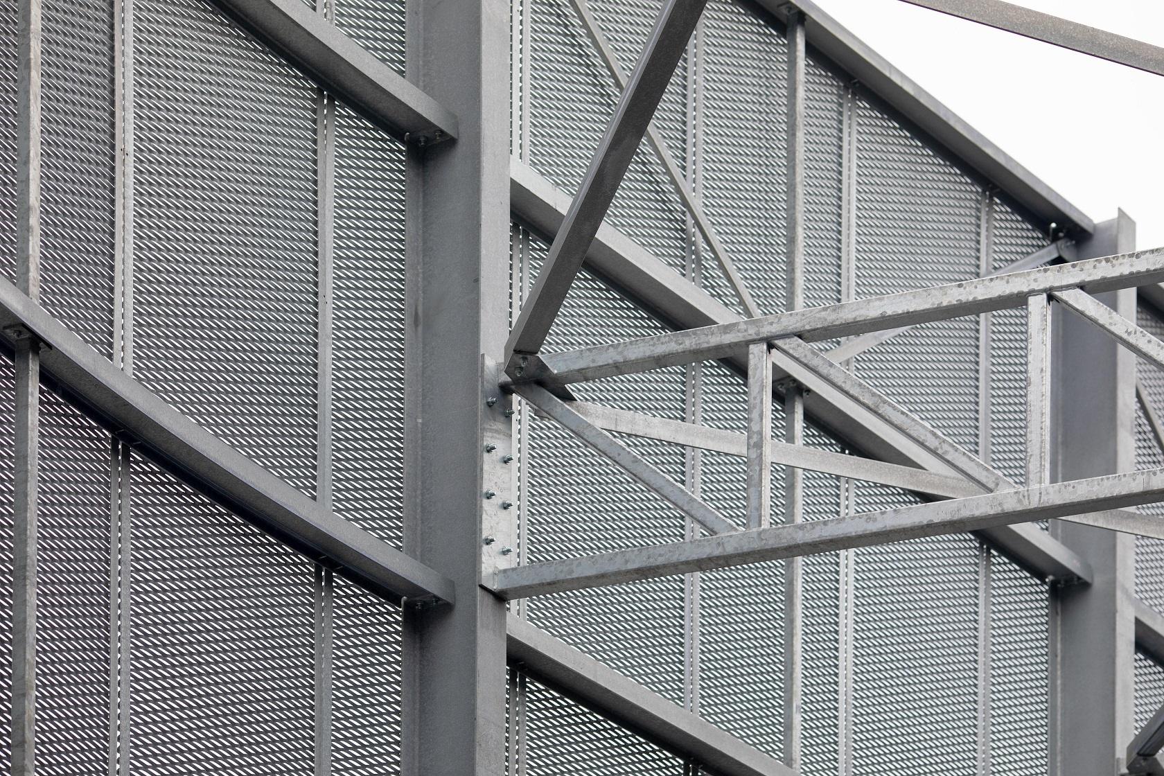 Metaalgevelbekleding met strekmetaal Classico 85 (warm verzinkt staal + RAL 7021) te Jambes.